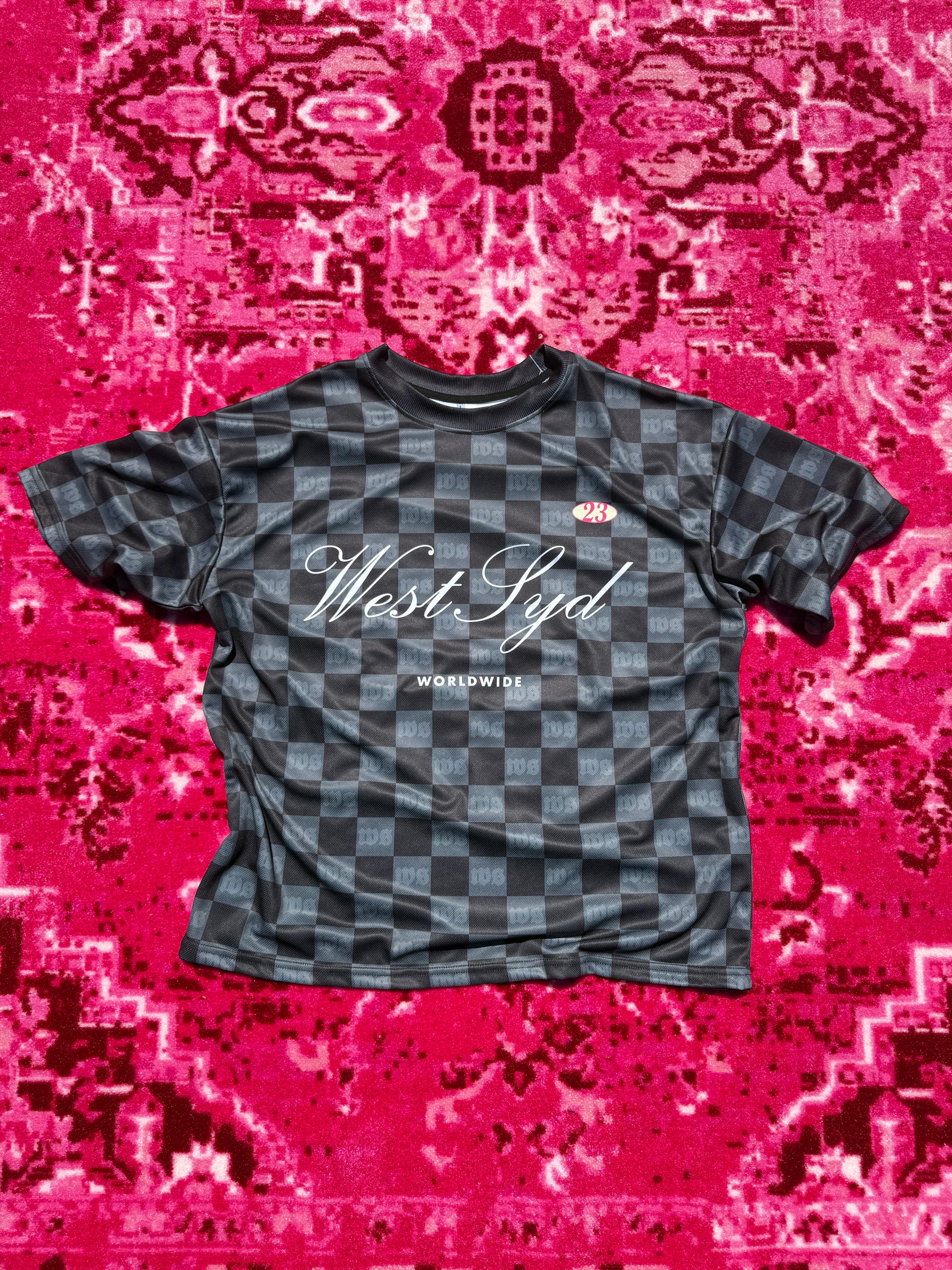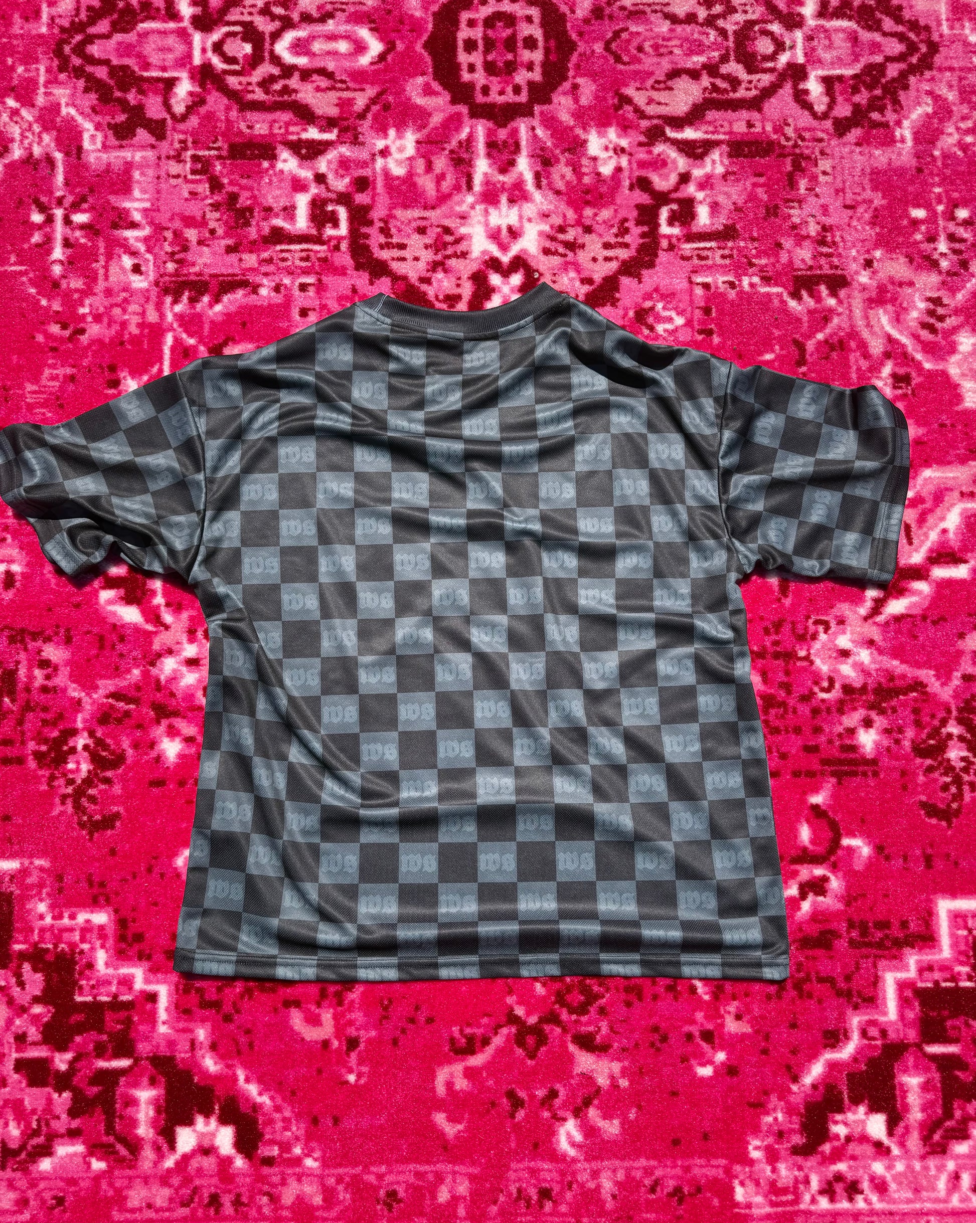 our ‘westsyd checkers’ soccer jersey in black & grey. please note our NFL jerseys are an oversized, drop shoulder, box fit.