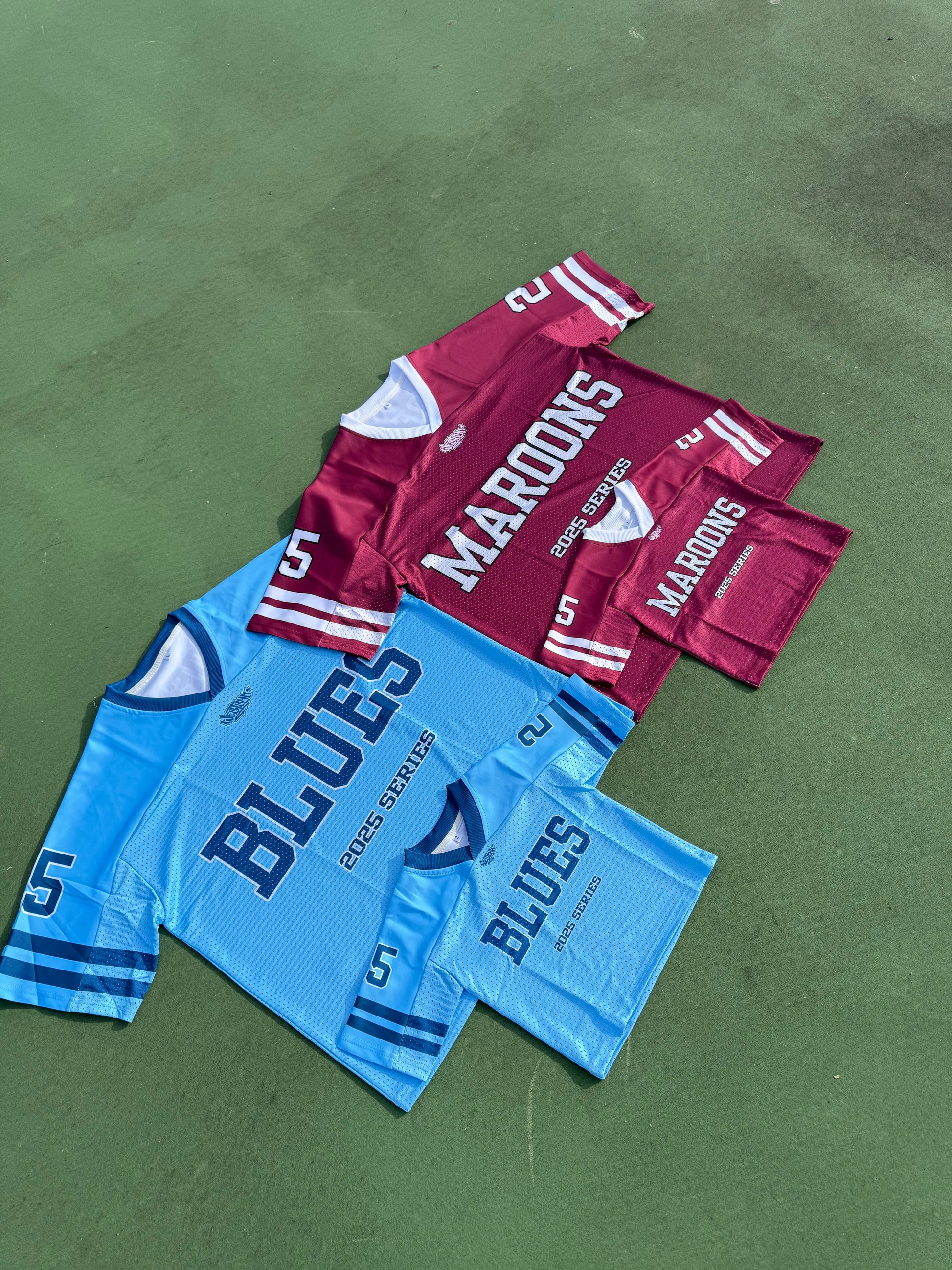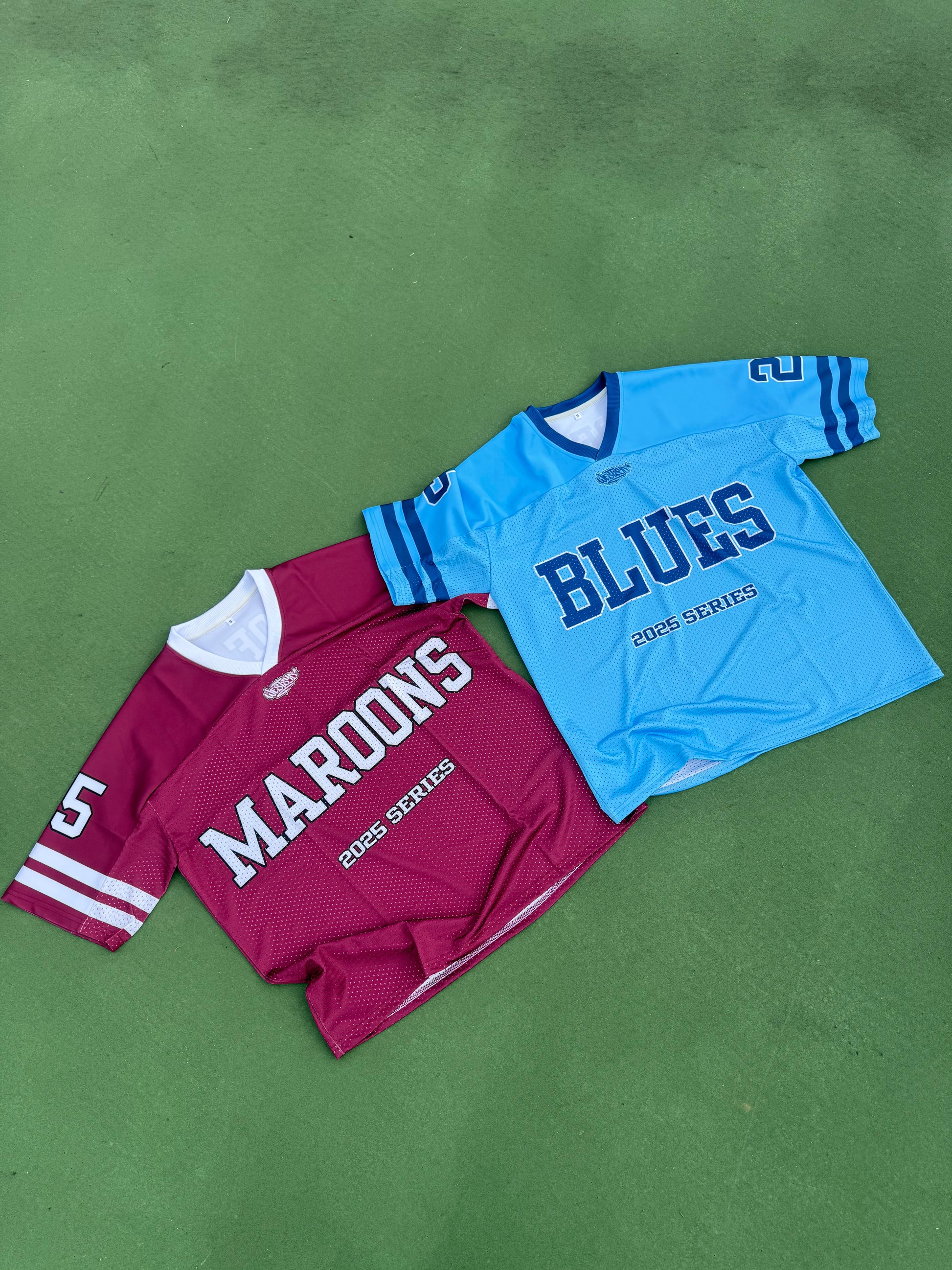 our ‘westsyd origin’ nfl jerseys in maroon/white and blue/navy. please note our NFL jerseys are an oversized, drop shoulder, box fit.
